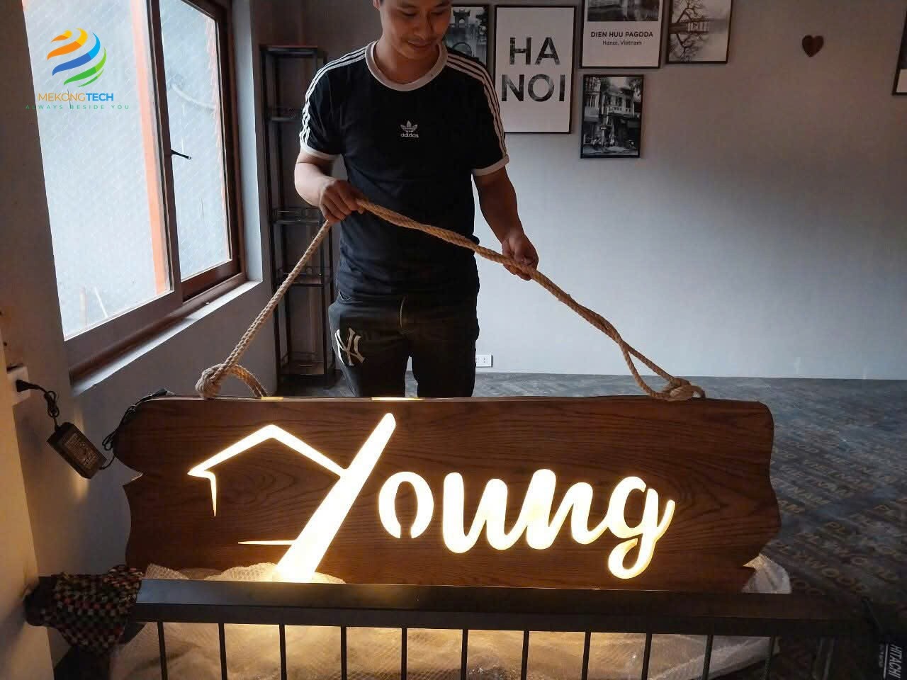 Bảng hiệu gỗ gắn led phát sáng rất đơn giản nhưng vô cùng sang trọng