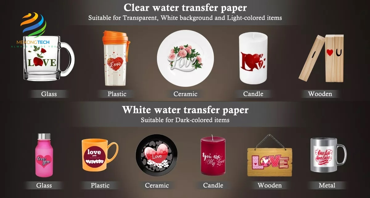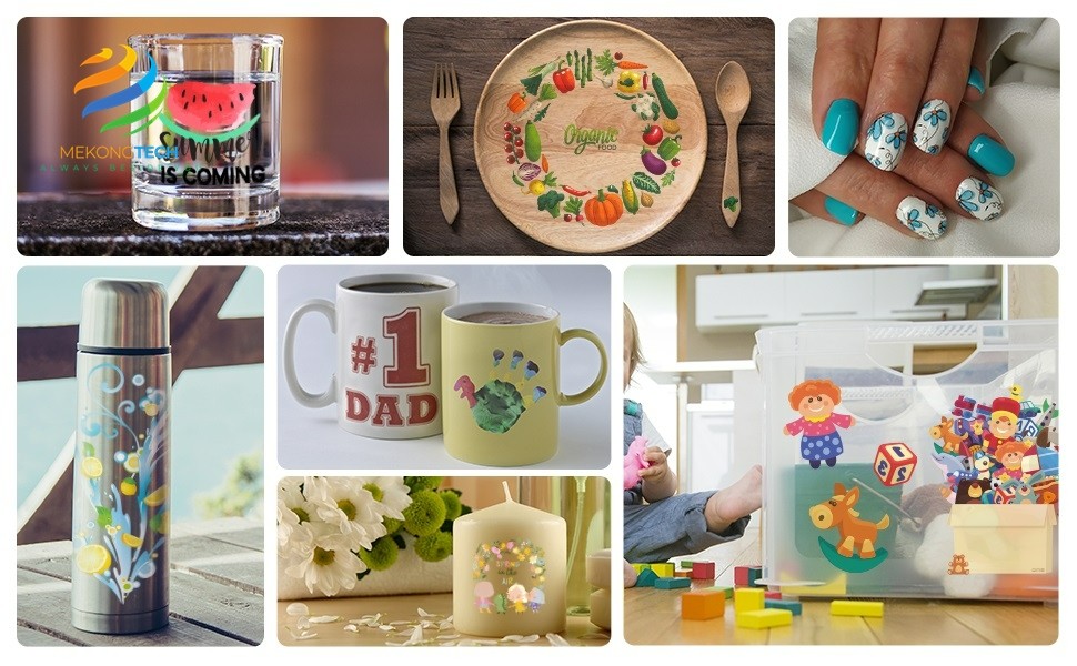 - Quà tặng và vật kỷ niệm: Tạo quà tặng được cá nhân hóa bằng cách dán đề can trượt nước lên các vật phẩm như khung ảnh, đồ trang trí và hộp đựng đồ trang sức.