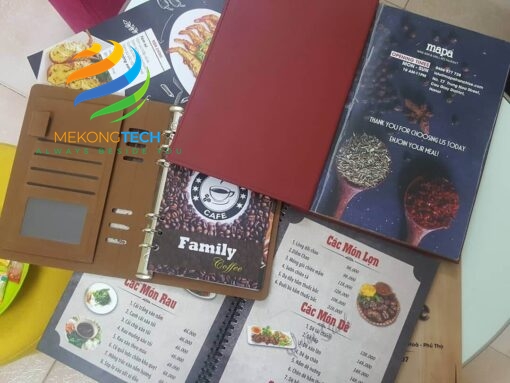 In menu bìa cứng tại Mekong Tech Việt Nam không chỉ mang lại sự sang trọng và chuyên nghiệp cho thực đơn của bạn mà còn đảm bảo độ bền và khả năng chống nước, giúp bảo vệ nội dung bên trong khỏi các yếu tố bên ngoài. Chúng tôi sử dụng chất liệu cao cấp, dễ dàng vệ sinh và bảo trì, giúp bạn tiết kiệm thời gian và chi phí trong việc thay thế. Đặc biệt, với thiết kế tùy chỉnh, bạn có thể thể hiện phong cách riêng của nhà hàng, quán cà phê, hay khách sạn, tạo ấn tượng mạnh mẽ với khách hàng ngay từ cái nhìn đầu tiên. Mekong Tech cam kết mang đến dịch vụ in ấn chất lượng cao với giá cả cạnh tranh, đảm bảo sự hài lòng cho mọi khách hàng.