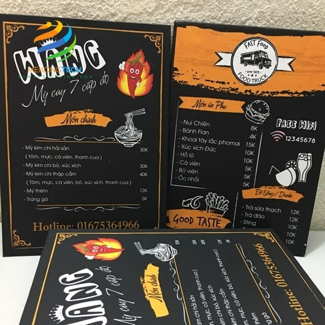 In menu bìa cứng tại Mekong Tech Việt Nam không chỉ mang lại sự sang trọng và chuyên nghiệp cho thực đơn của bạn mà còn đảm bảo độ bền cao, giúp bảo vệ nội dung bên trong khỏi các yếu tố bên ngoài. Chất liệu bìa cứng được chọn lọc kỹ lưỡng, tạo cảm giác chắc chắn và dễ dàng vệ sinh. Hơn nữa, dịch vụ thiết kế tùy chỉnh của chúng tôi cho phép bạn thể hiện phong cách riêng, thu hút khách hàng ngay từ cái nhìn đầu tiên. Đội ngũ nhân viên tận tâm và chuyên nghiệp sẽ hỗ trợ bạn từ khâu lên ý tưởng đến hoàn thiện sản phẩm, đảm bảo sự hài lòng tối đa.