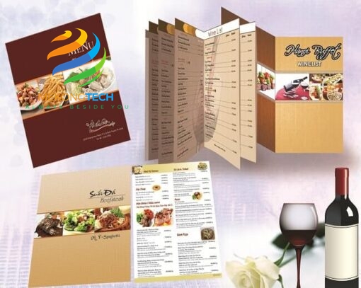 - Gia công: Sau khi in xong, menu sẽ được gia công như cắt, bế, hoặc ép plastic để tăng độ bền và tính thẩm mỹ.