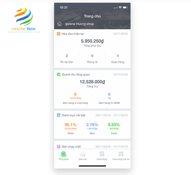 - Báo cáo thời gian thực: Chủ kinh doanh sẽ xem được các báo cáo về doanh thu, mặt hàng tồn kho, mặt hàng bán chạy và hiệu suất làm việc của nhân viên ở mọi lúc mọi nơi trên ứng dụng, website và email.