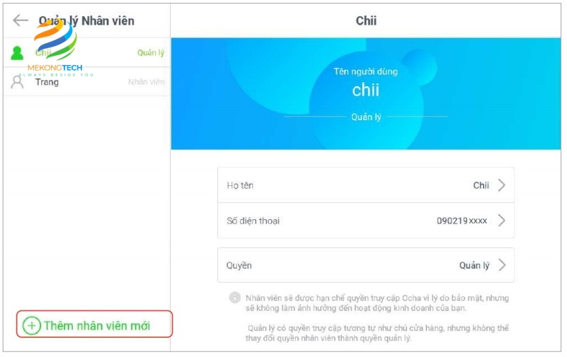- Quản lý nhân viên: Tính năng này có 3 cấp độ truy cập: chủ quán, quản lý và nhân viên. Bạn có thể tạo, xóa nhiều tài khoản nhân viên và cấp quyền sử dụng tương ứng cho từng cấp độ truy cập 1 cách dễ dàng trên phần mềm Ocha.