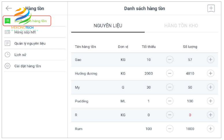 - Quản lý hàng tồn: Phần mềm Ocha luôn theo dõi hàng tồn theo thời gian thực và cảnh báo tự động khi kho sắp hết hàng. Bạn chỉ cần tạo và tùy chỉnh nguyên liệu thành phần liên kết món ăn với nguyên liệu trong kho. Ứng dụng hỗ trợ quản lý hàng tồn theo 2 dạng là nguyên liệu và hàng tồn kho để phù hợp với loại mô hình kinh doanh của các doanh nghiệp.